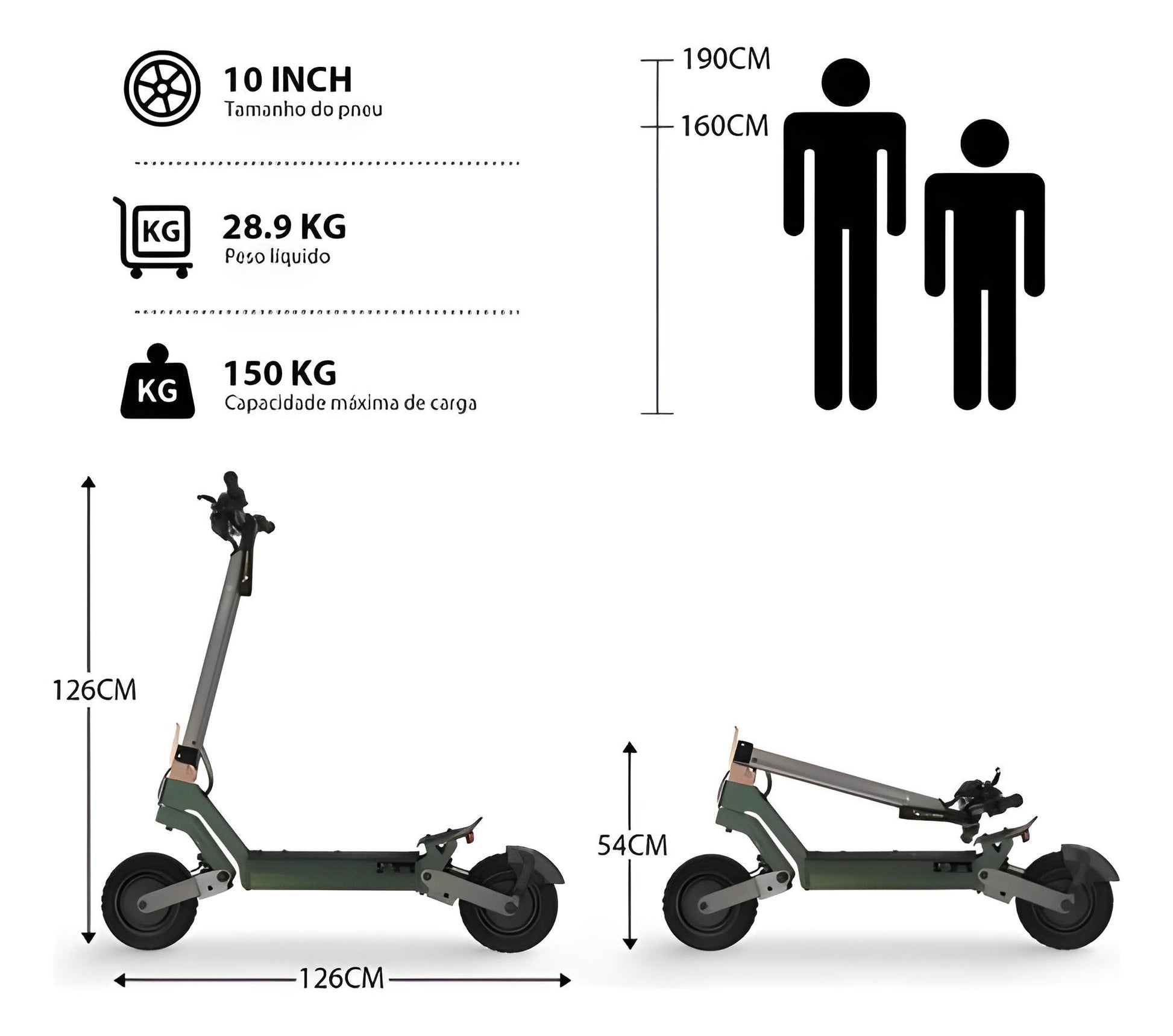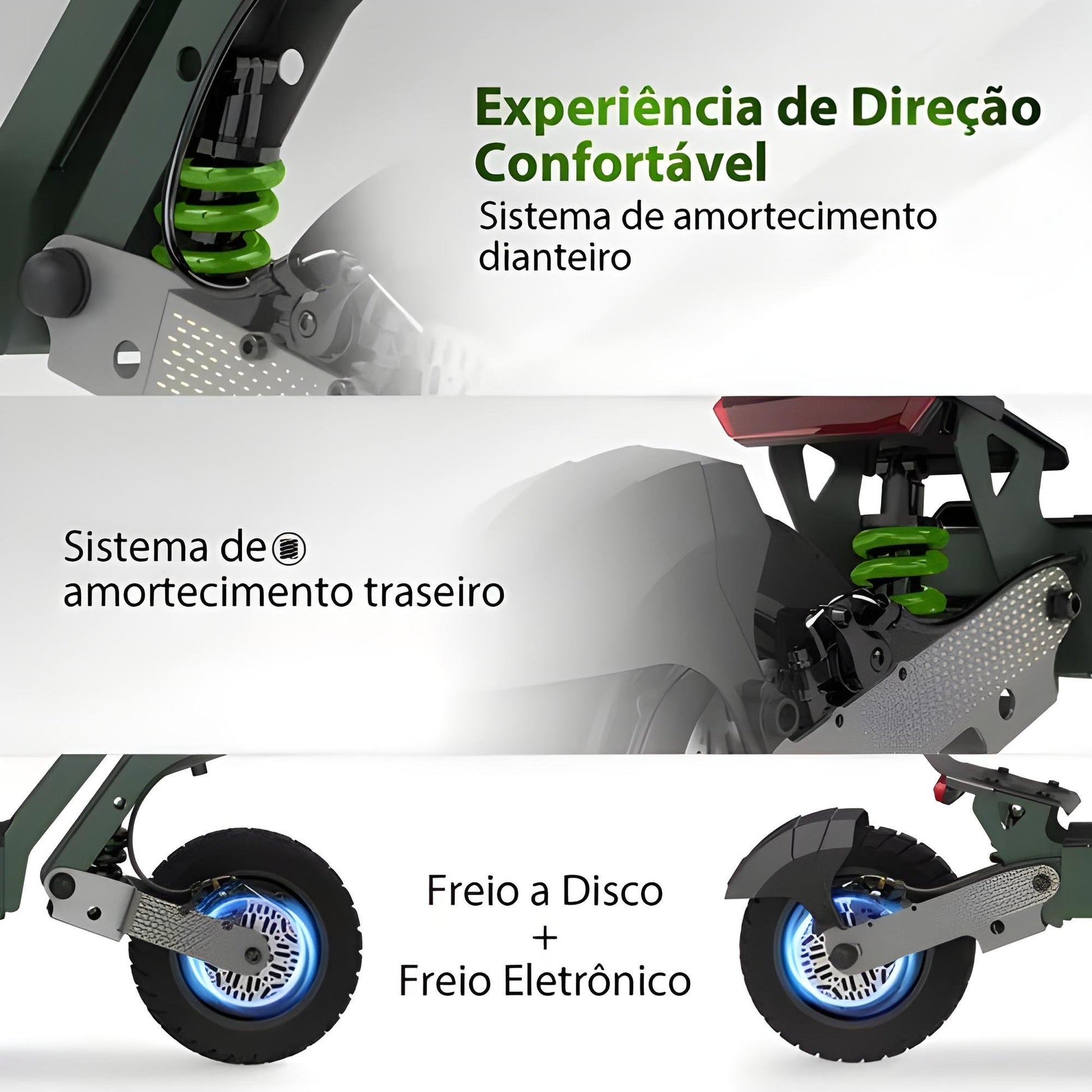 🌟 Conforto Absoluto – Pneus a vácuo de 10”, amortecedores duplos e estrutura de aço + alumínio suportam até 150 kg.