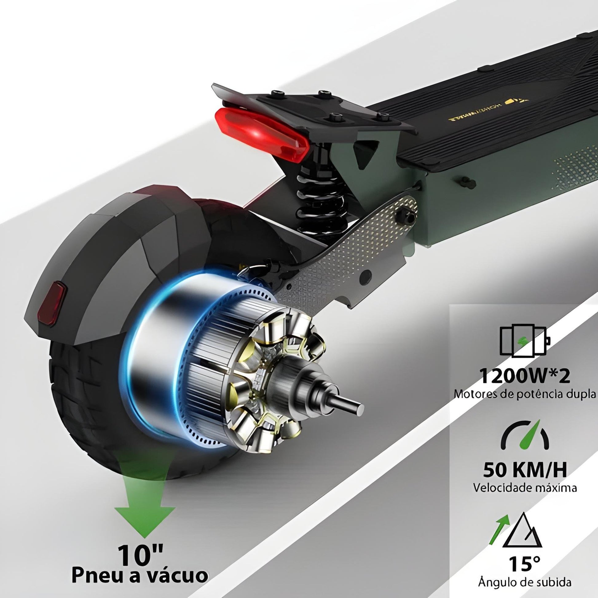 ⚡ Motores Duplos 1200W – Com potência total de 2400W, atinge até 50 km/h e encara subidas de 15° com facilidade.