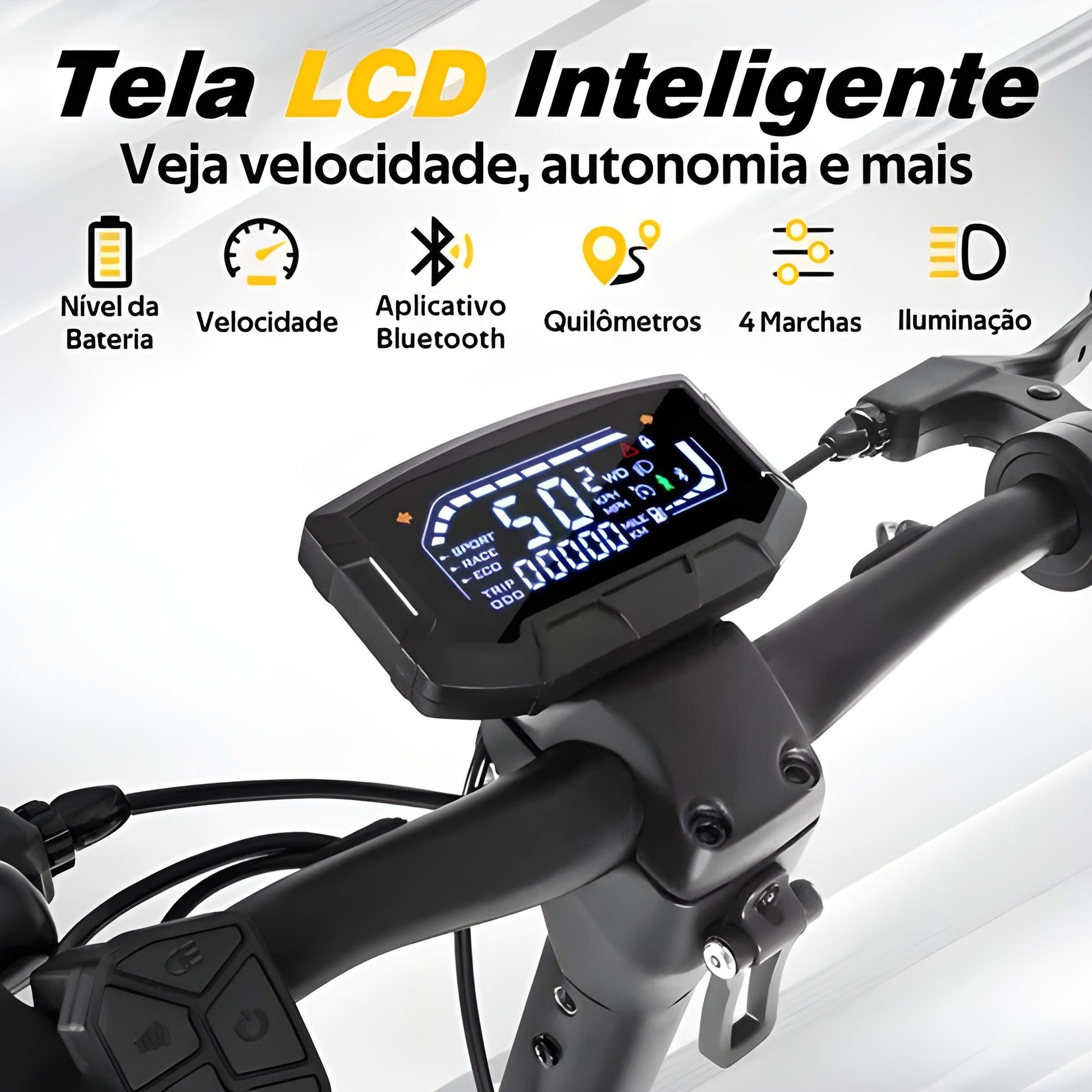 📲 Tecnologia Avançada – Tela LCD HD, conectividade Bluetooth e modo de cruzeiro inteligente para mais conforto.
