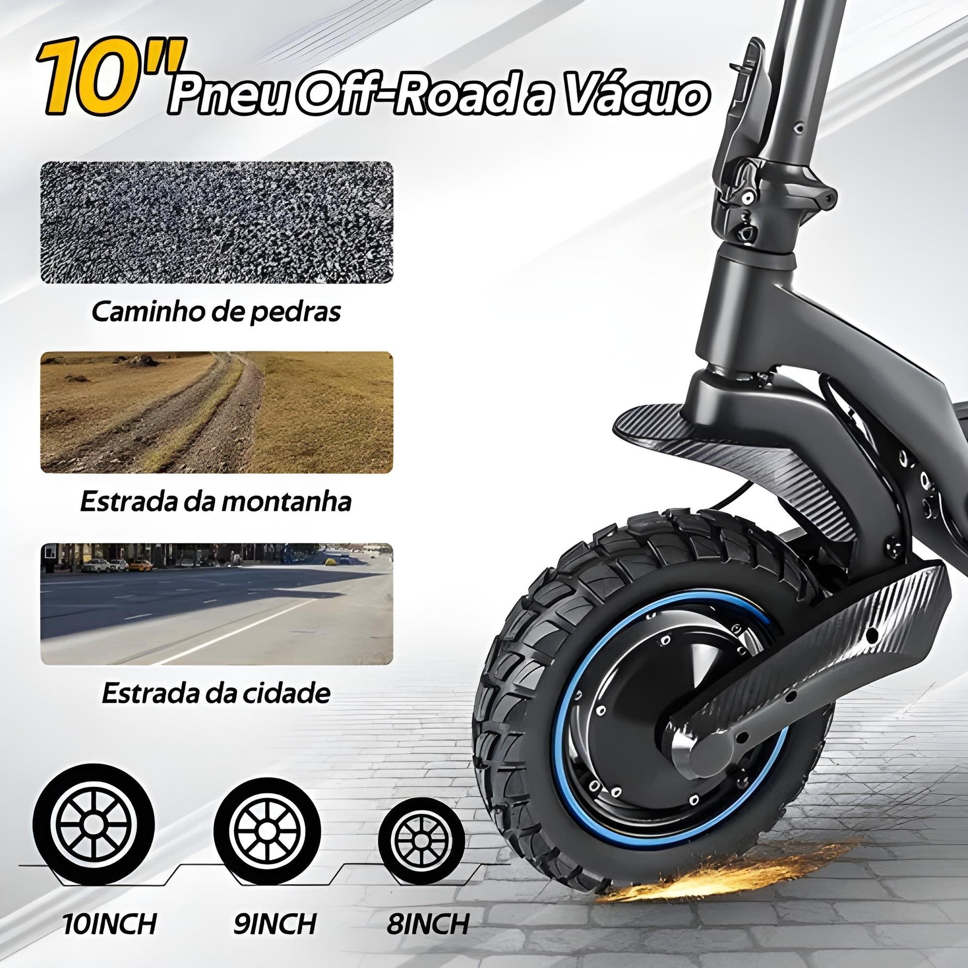 🛑 Máxima Segurança – Freios a disco dianteiro e traseiro, pneus off-road de 10” antiderrapantes e luz traseira de alerta.