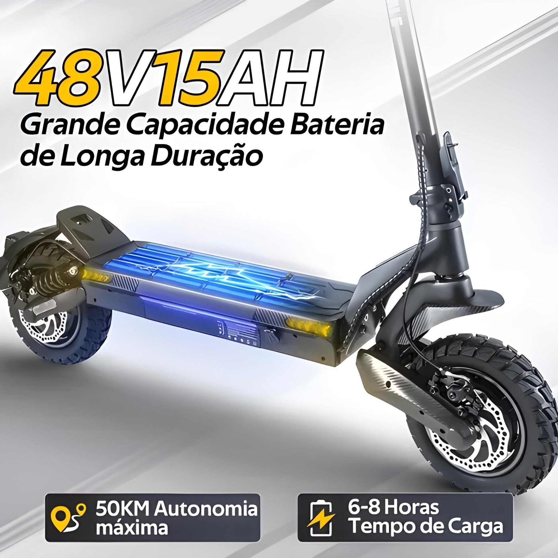 🔋 Autonomia de 50 km – Bateria de alta capacidade (48V 15AH) para trajetos longos sem preocupações.